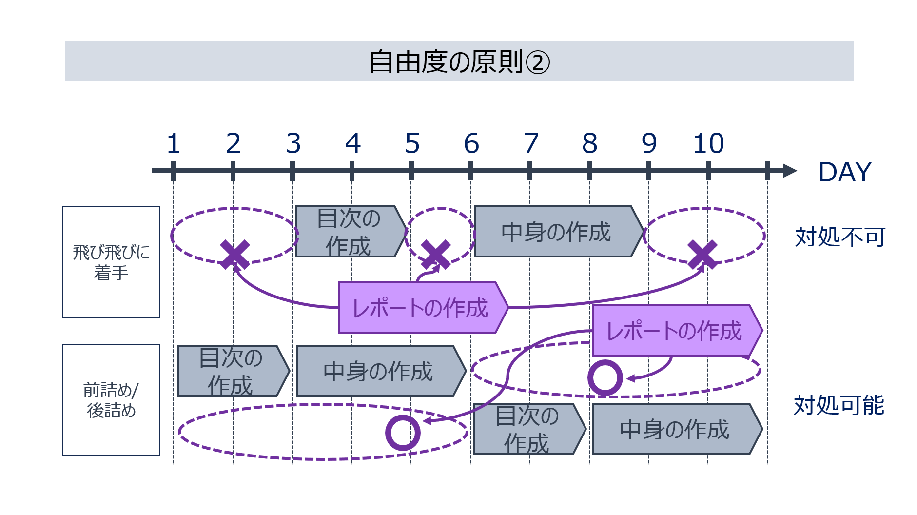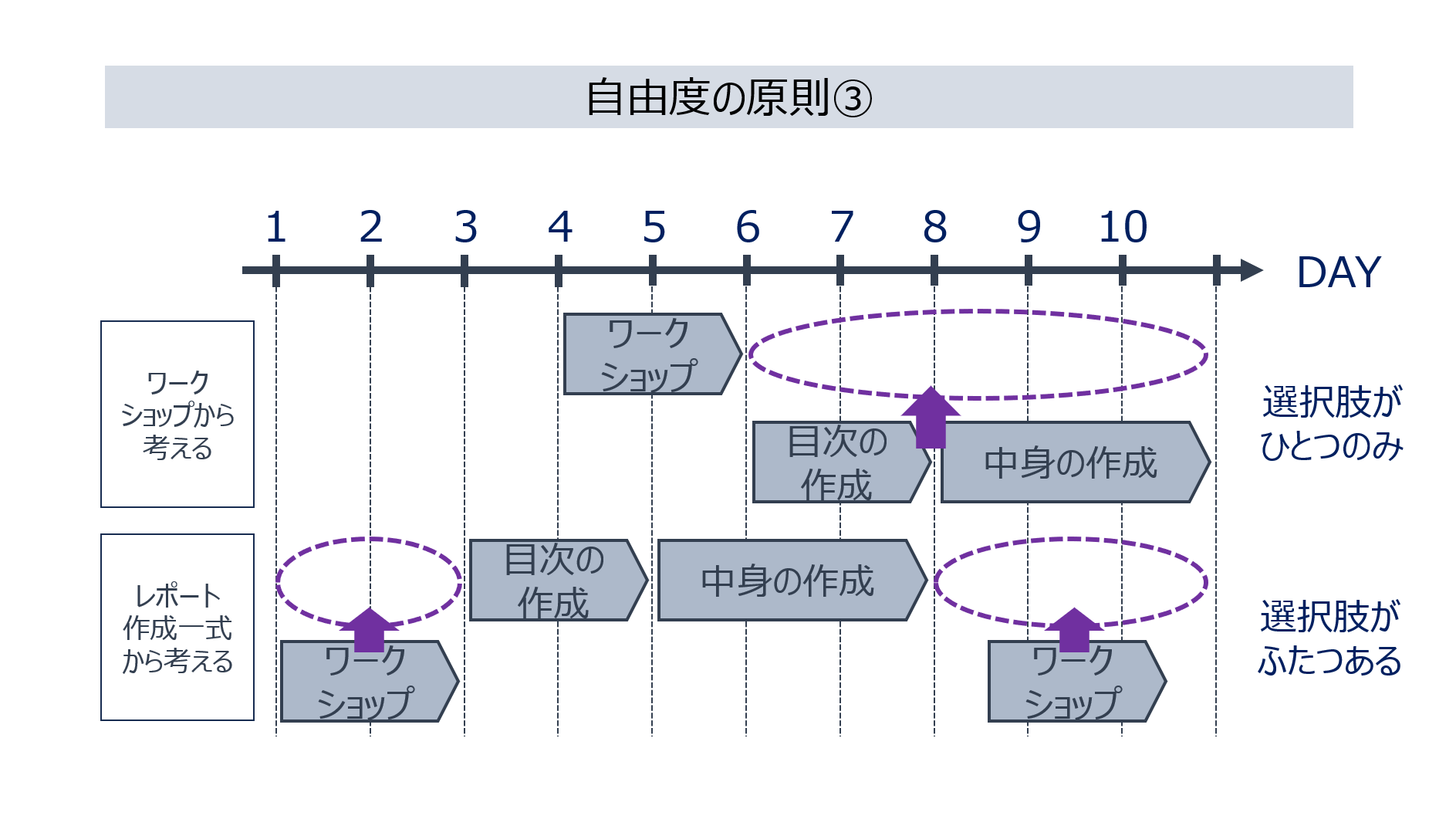 最後の原則です。これはレポートの話の続きで、別の業務のワークショップ実施が2日入ったとします。レポートが全体で5日の工程、ワークショップが2日です。これを10日間の内に配置して計画しようとすると、レポートをまずどうするかを考えるはずです。なぜなら、10日のうち自由にワークショップの2日をいれてしまうと、レポートが終わらない可能性があるからです。例えば4,5日目にワークショップをやろうとします。そうすると、6-10日の間にしかレポートを行える選択肢しか残されていません。こうした自由度を考えると、レポート作成一式=自由度最小のタスクから考えて、残った期間にワークショップを考える方が予定を組みやすくなります。