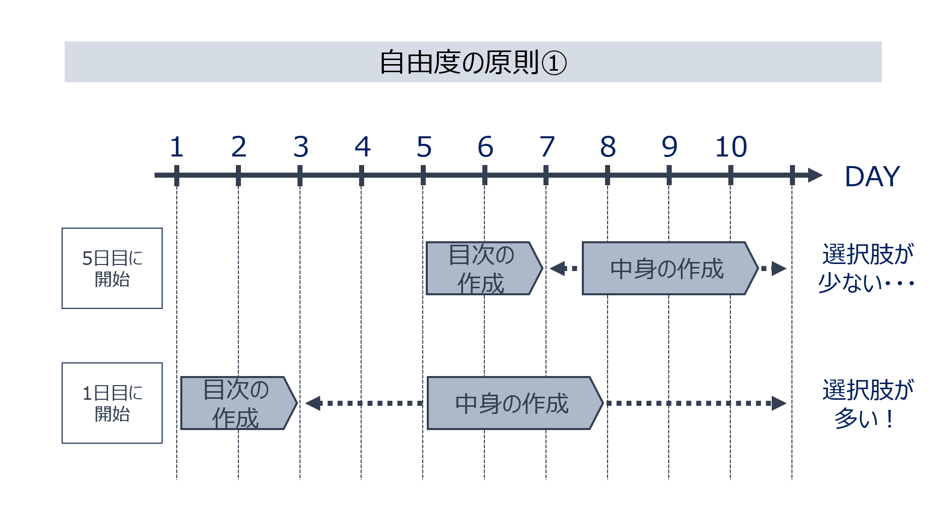 これは、どういうことかというと、例えば10日間の期日でレポートを書くとして、目次の作成(2日)→ 中身の作成(3日)という工程に分かれるとします(目次を作成する前に中身の作成をすることはできない、つまり順序に制約があります)。極端な例を挙げると、5日目に目次の作成を始めると、あと4日間で3日分の工程が残っています。いつ行うかの自由度が低くなります。一方で、1日目に目次の作成に着手するならば、3日目に中身の作成をするのか、もしくはぎりぎりまで遅らせて8日目に着手することも可能です。これは自由度がかなり高い状態です。ある工程の着手する日を決めると、その決定が他のタスクの自由度を消費してしまうことがあります。そのため、なるべく自由度を高める選択肢を選びましょう、ということです。