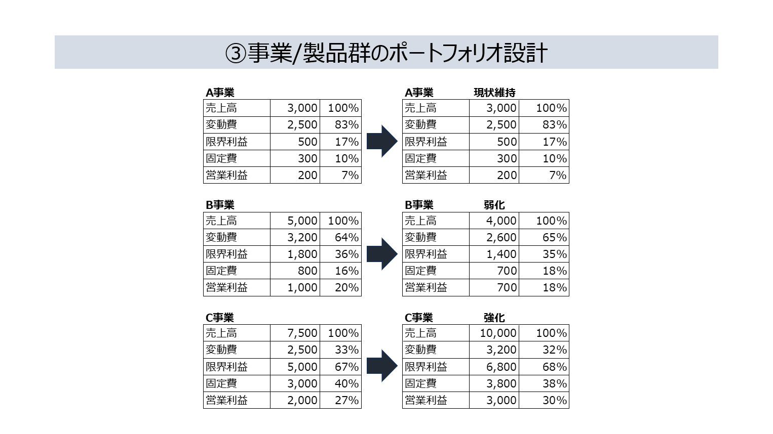 事業や製品群毎に変動費と固定費を算出できるようにしておけば、どの事業や製品群を伸ばすのか、といった自社リソースの配分や強化・育成の方針を決めることができます。定性的な戦略ではなく、実際の利益率や販売数量をベースに議論ができるようになります。以下の表のケースでは、C事業を伸ばす代わりにB事業を抑えめにし、A事業は現状維持とした場合にどうなるかを可視化したものです。