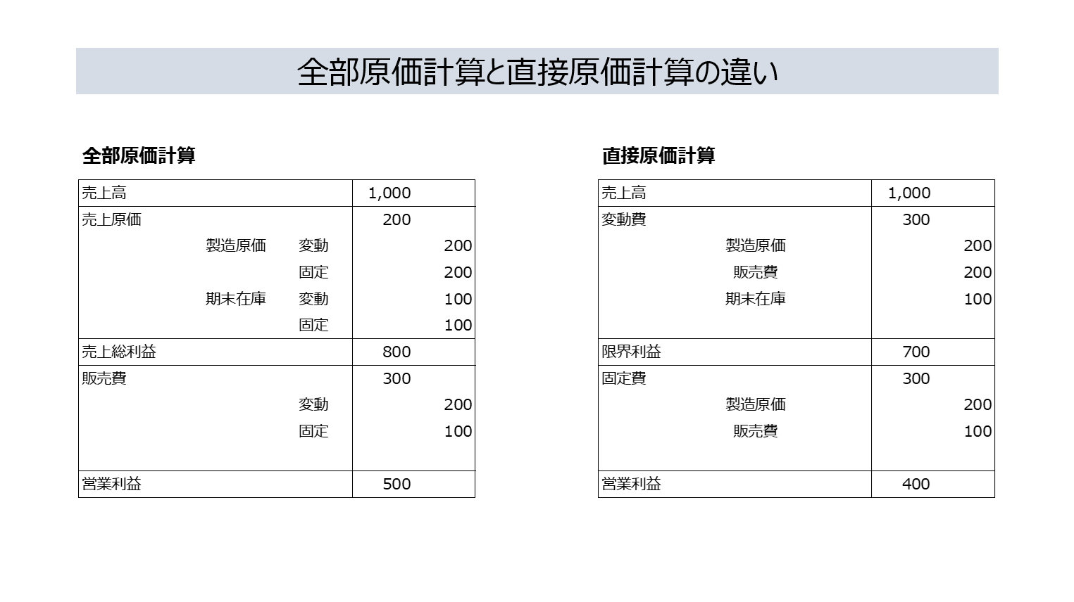 事業開始時に在庫は無く、途中でモノを作って期末に在庫(=200)が生じてしまった、という前提で見てください。また、両者の繋がりがわかるように、全部原価計算の売上原価と販売費を変動と固定で分けています。本来であれば分けている表記はありません。