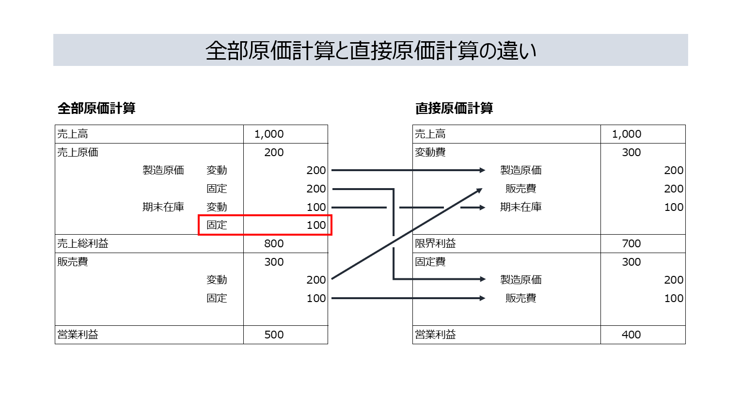 期末在庫の固定100(固定製造原価)の分は在庫に計上する(製品原価)ことで売上原価から減算