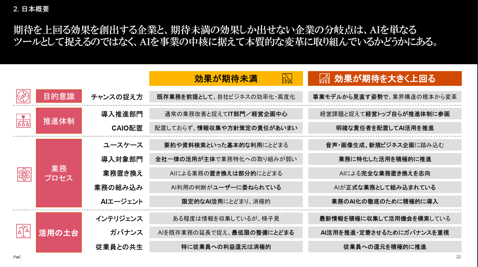 ・日本企業は、生成AIを効率化ではなく変革と再定義し、高い目標、革新文化の情勢、ビジネスモデルの再構築に取組む必要がある