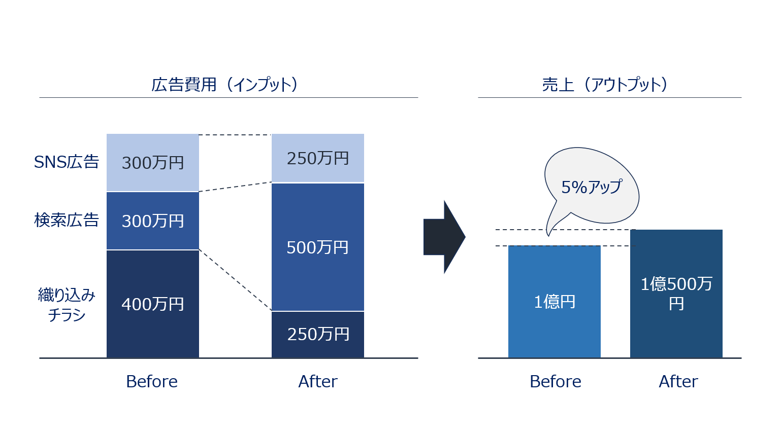 総額は変えず、売上が伸びやすい検索広告に予算を寄せた配分です。この結果、売上が 1億500万円 に伸びました。(+500万円、+5%)