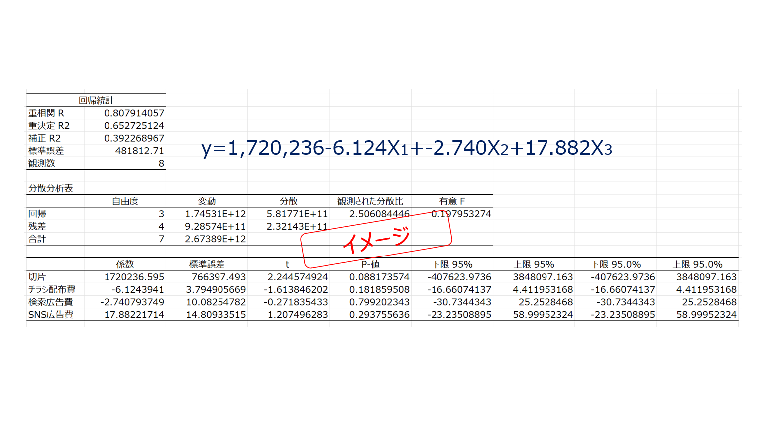次に、売上を結果、広告施策を要因として重回帰分析を行います。ここでやっていることは、チラシも検索広告もSNS広告も同時に出している状況で、それぞれが売上にどう関係していそうかを一度、機械的に整理することです。この結果から、予算を増やしても売上があまり動かなそうな施策比較的、増やした分だけ売上が動きやすそうな施策という大まかな傾向をつかみます。重要なのは、この時点では信じ切らないことです。あくまで一次案、仮説の出発点です。(以下重回帰分析のイメージ例を添付します。Excelで実施可能ですが、計算の意味合いなどは今回割愛)