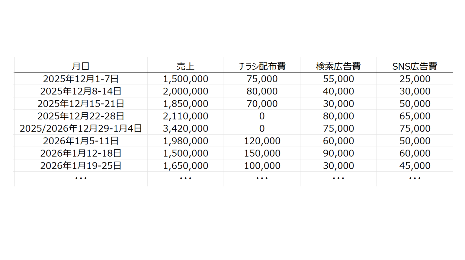 まず、売上と各広告施策のデータを、月次や週次など同じ期間単位の時系列データとして並べます。